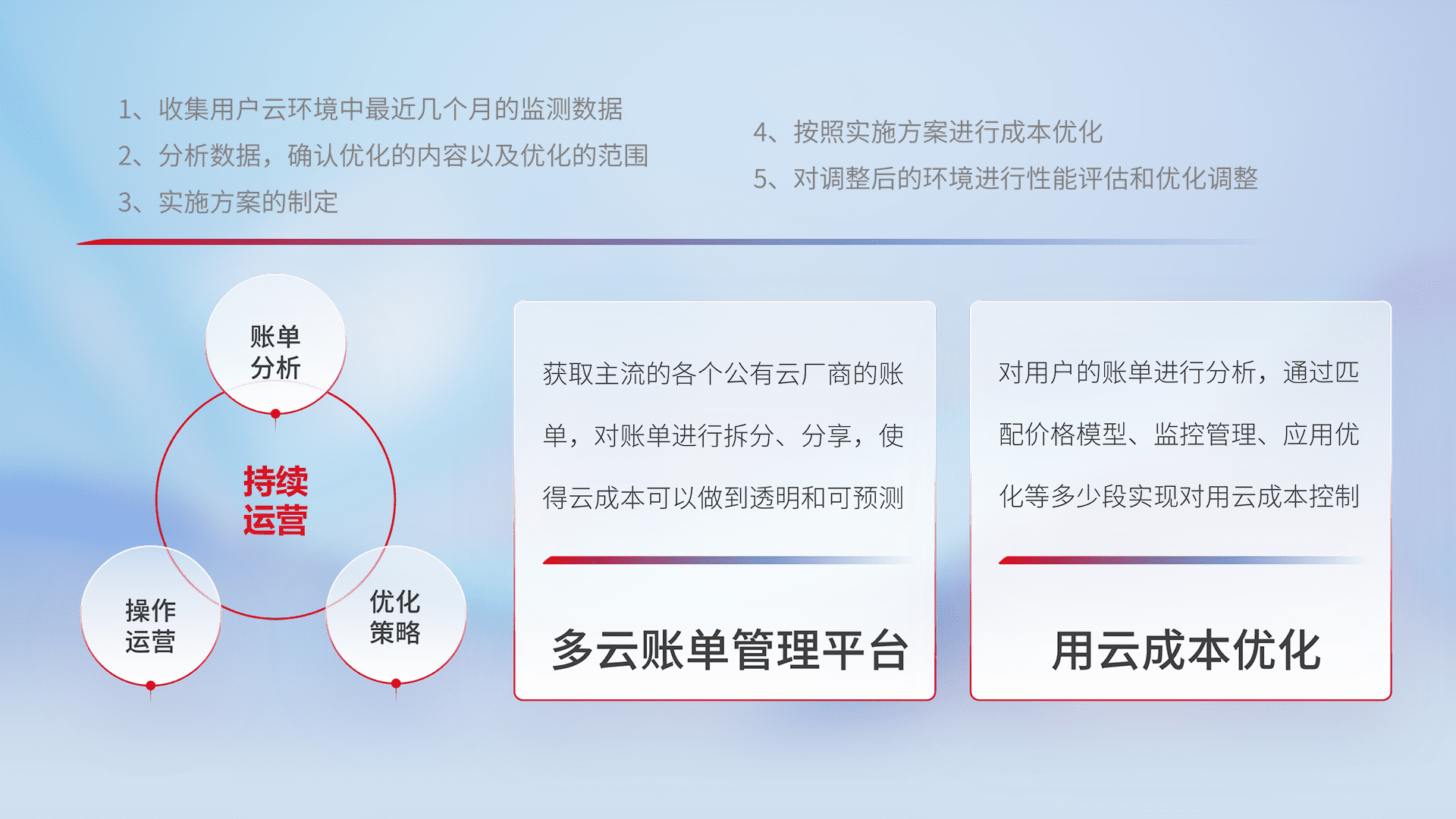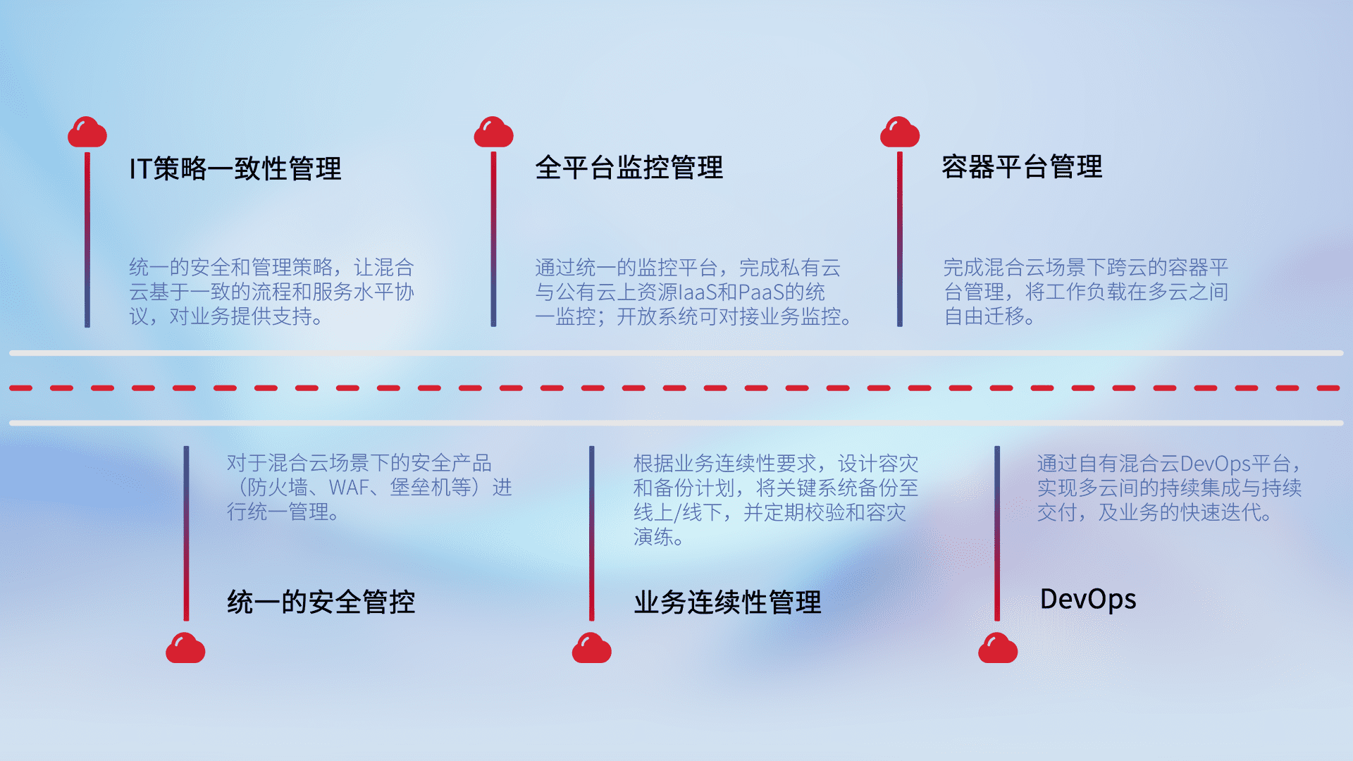 通过多云纳管,,,,以统一的资源数据模型把客户的云资源进行抽象和封装,,,,进而实现对多云资源的统一操作,,保障云资源管理的可靠性、、、、稳定性与可用性。。。。量身定制化运维内容,,,配置、、、开发运维、、、、补丁管理、、、备份、、、、监控、、、认证和访问管理、、、、审计和日常巡检等,,,保障在用云过程中的可靠度,,,,稳定度以及高可用率。。